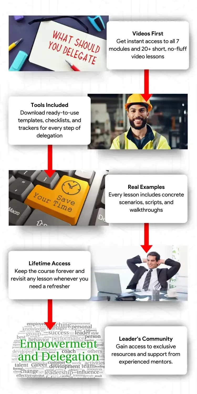 You either check in constantly and feel like a micromanager, or you disappear completely and pray nothing explodes. Both approaches fail—one trains your team to be helpless, the other leaves problems hidden until it's too late to fix them. This module shows you how to stay engaged without suffocating people, how to catch issues when they're still small and fixable, and how to coach your team through challenges instead of solving every problem for them. You'll learn the exact timing and questions that reveal what's really happening—so you can course-correct early, build capable people, and finally escape the exhausting cycle of either doing everything yourself or cleaning up disasters you didn't see coming.